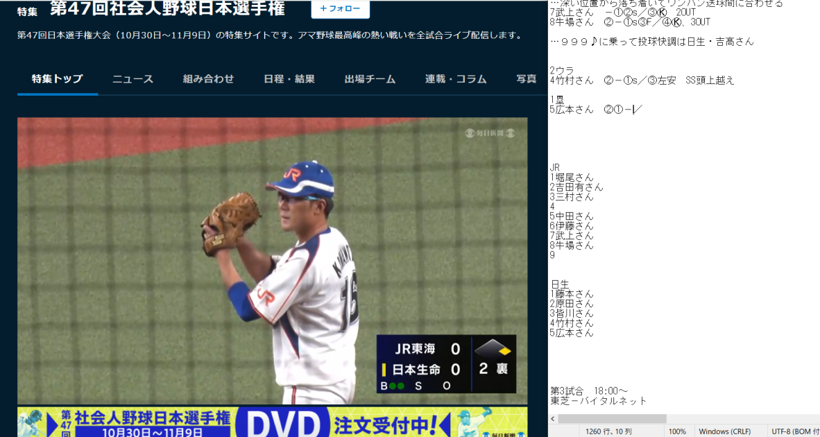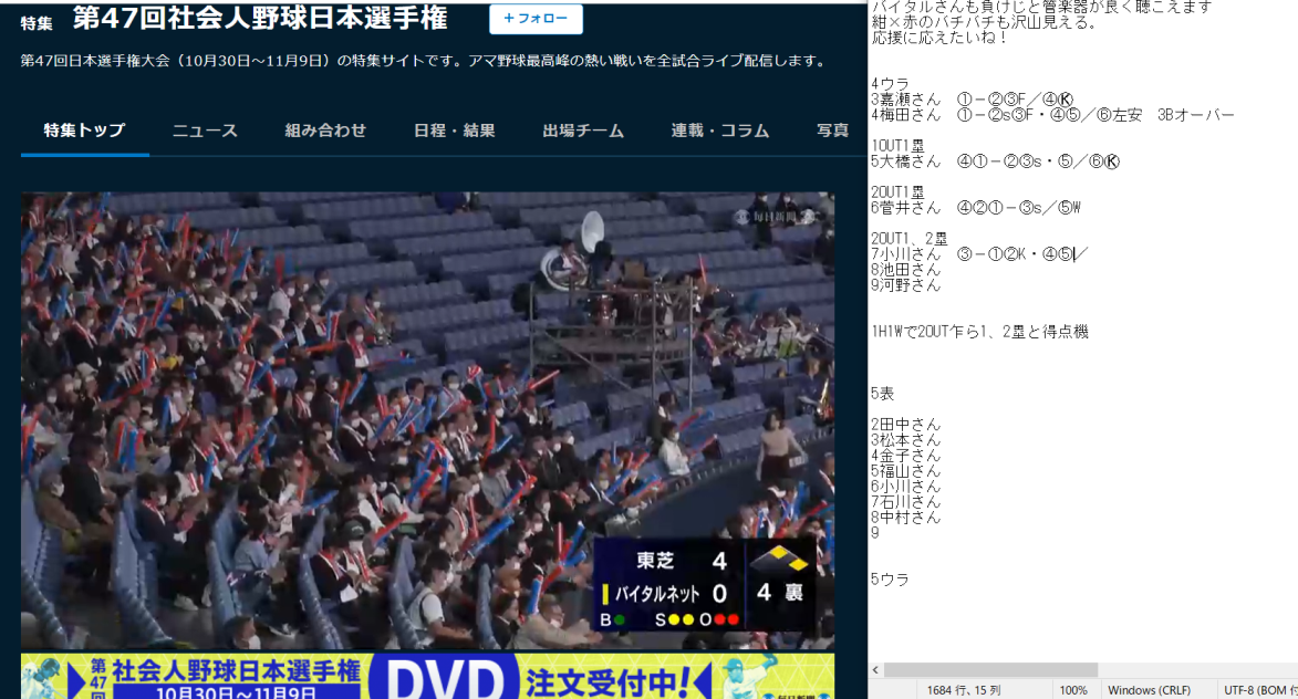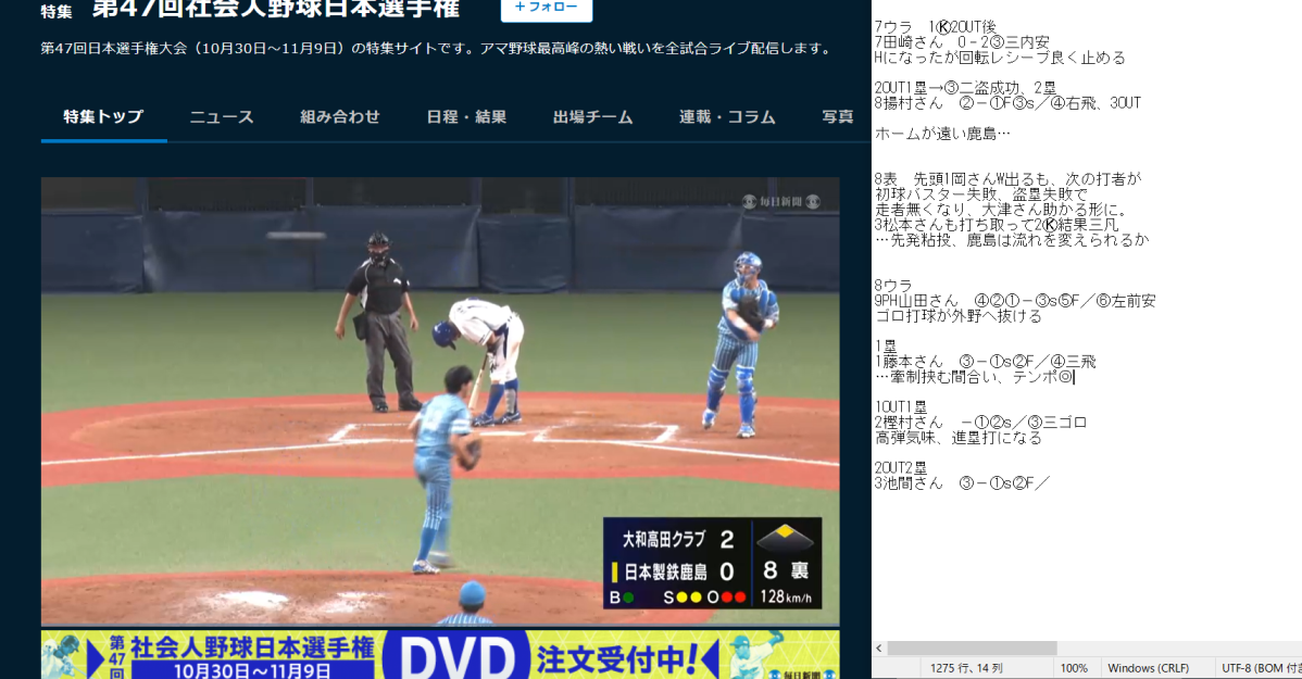 では以下より試合メモ。一球記録は付けられる限り