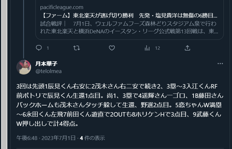 その後は先に貼ったメモの通りの流れで、打者一巡4得点でしおみんを援護。